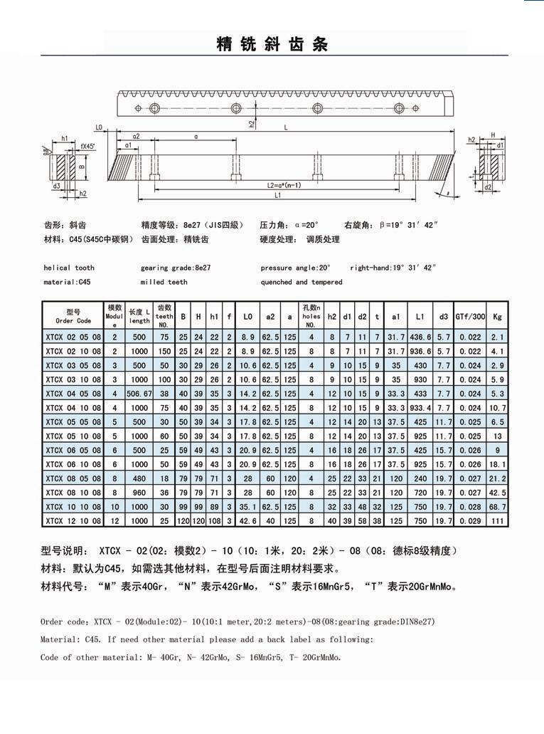 单支齿条长度2.2米(模数从M1-M20, 除了供应通用的直齿,斜齿齿条外,还开发出了整数齿距齿条等宜用规格,